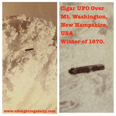 Cette photographie nous montre une formation de nuages au-dessus du sommet du mont. Washington à l'hiver 1870 - 1871 - avec un OVNI! On peut voir un objet en forme de cigare. Ce pourrait être la première photographie d'un OVNI. L'image fait partie d'un stereoview antique.